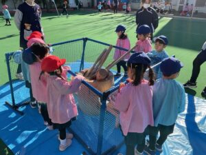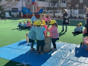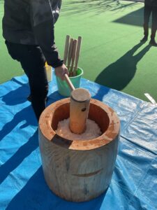 朝登園してくると園庭の真ん中には臼と杵が…!