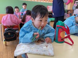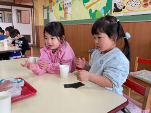 お餅はよく噛んでね、水筒も飲むんだよー!と