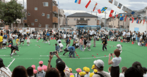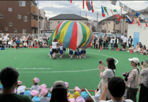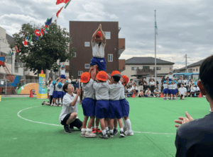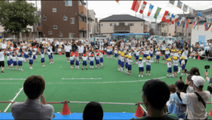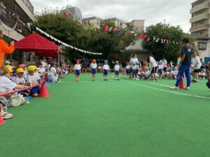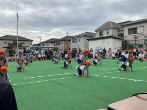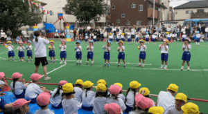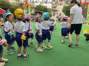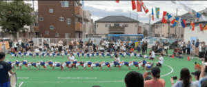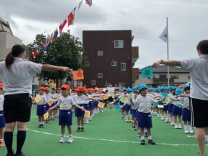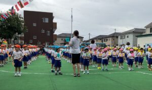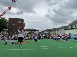 最後は全学年で、クラスカラーの旗を持ってはた体操です。